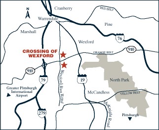 FROM NORTH Take 79 North to Wexford Exit. Make right onto 910 (orange belt). At second stop light, make left onto Wexford Run Road follow to Crossing of Wexford on right.